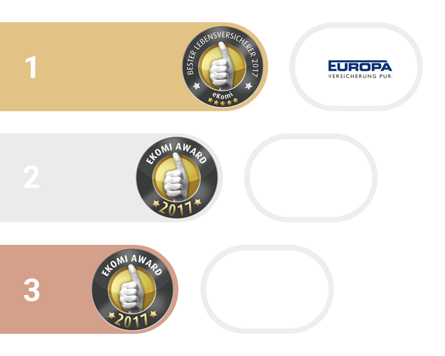 Der Beste Lebensversicherer 2017 und damit Preisträger des diesjährigen eKomi Awards geht an die EUROPA Versicherungen. Die EUROPA Versicherung hat 4,7 Punkte von 5,0 Punkten erreicht.