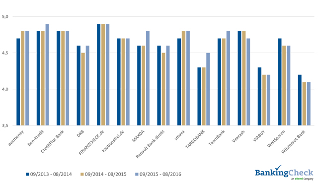 Im Rahmen des BankingCheck LangZeitTest 2016 werden neben dem BankingCheck Award-Siegeln, welche die besten Anbieter und Produkte der Finanzindustrie des Jahres auszeichnen, nun auch die Anbieter und Produkte prämiert, die beim LangZeitTest - Zeitraum 36 Monate - eine konstant hohe Kundenzufriedenheit vorweisen können, die insbesondere die Beständigkeit der Kundenzufriedenheit eines Anbieters und seiner Produkte honoriert.