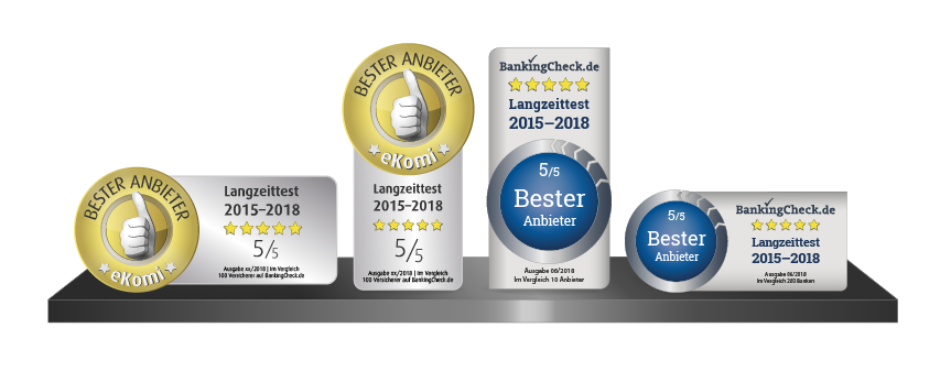 Wir belohnen permanente Qualität – und zwar mit unserem BankingCheck und eKomi LangZeitTest -Siegel. Als Konstante der Finanz- und Versicherungsbranche betrachten wir jedes Jahr am 1. Oktober die Performance der vergangenen 3 Jahre und zeichnen die Unternehmen und Produkte aus, die über diesen Zeitraum eine hohe Kundenzufriedenheit aufgewiesen haben.
